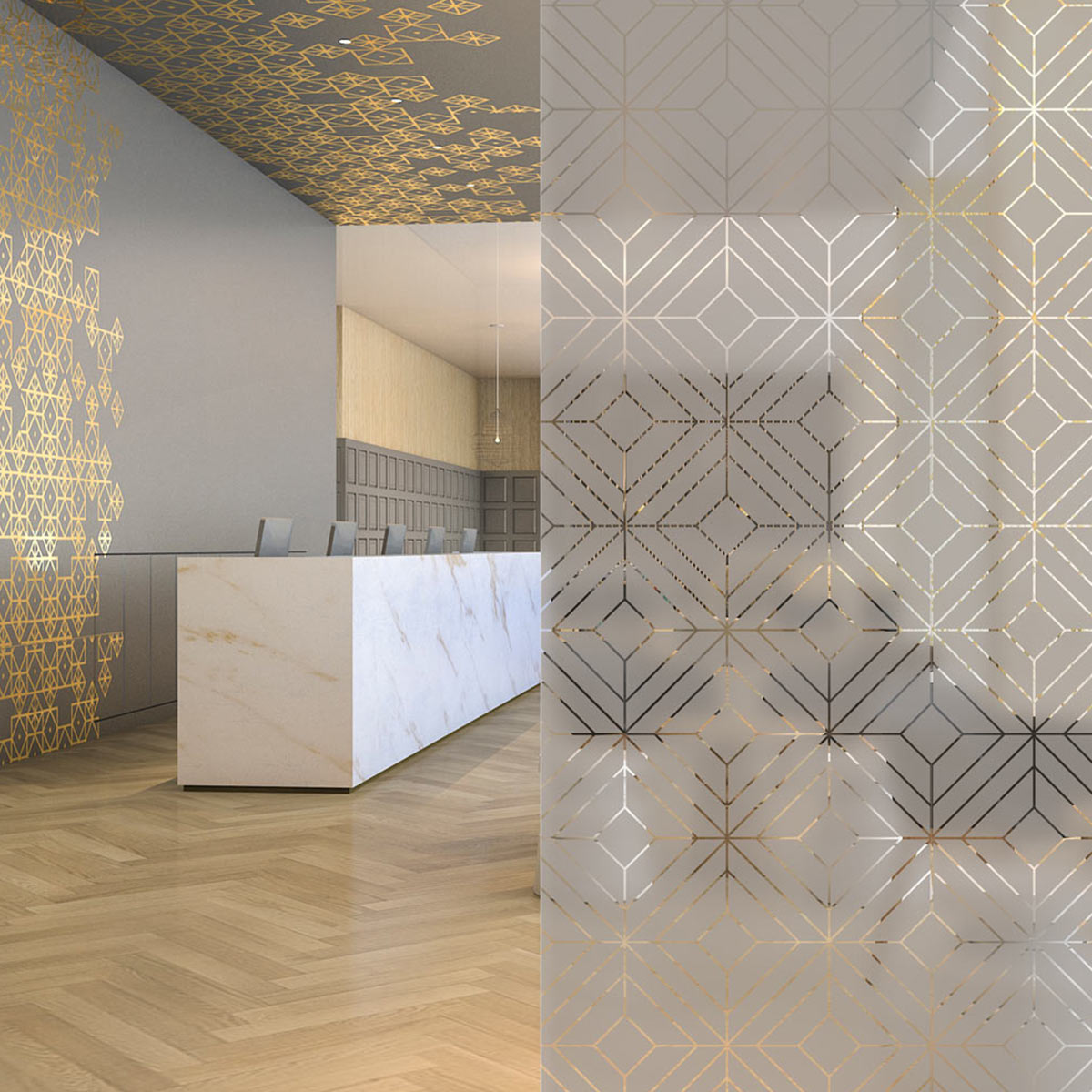Konturgeschnittene Sandstrahlfolie mit seidenmatter, transparenter Oberfläche für die Verklebung auf Glas – vermittelt den Eindruck einer sandgestrahlten Oberfläche. Wird auch als Glasdekorfolie oder Satinatorfolie bezeichnet.